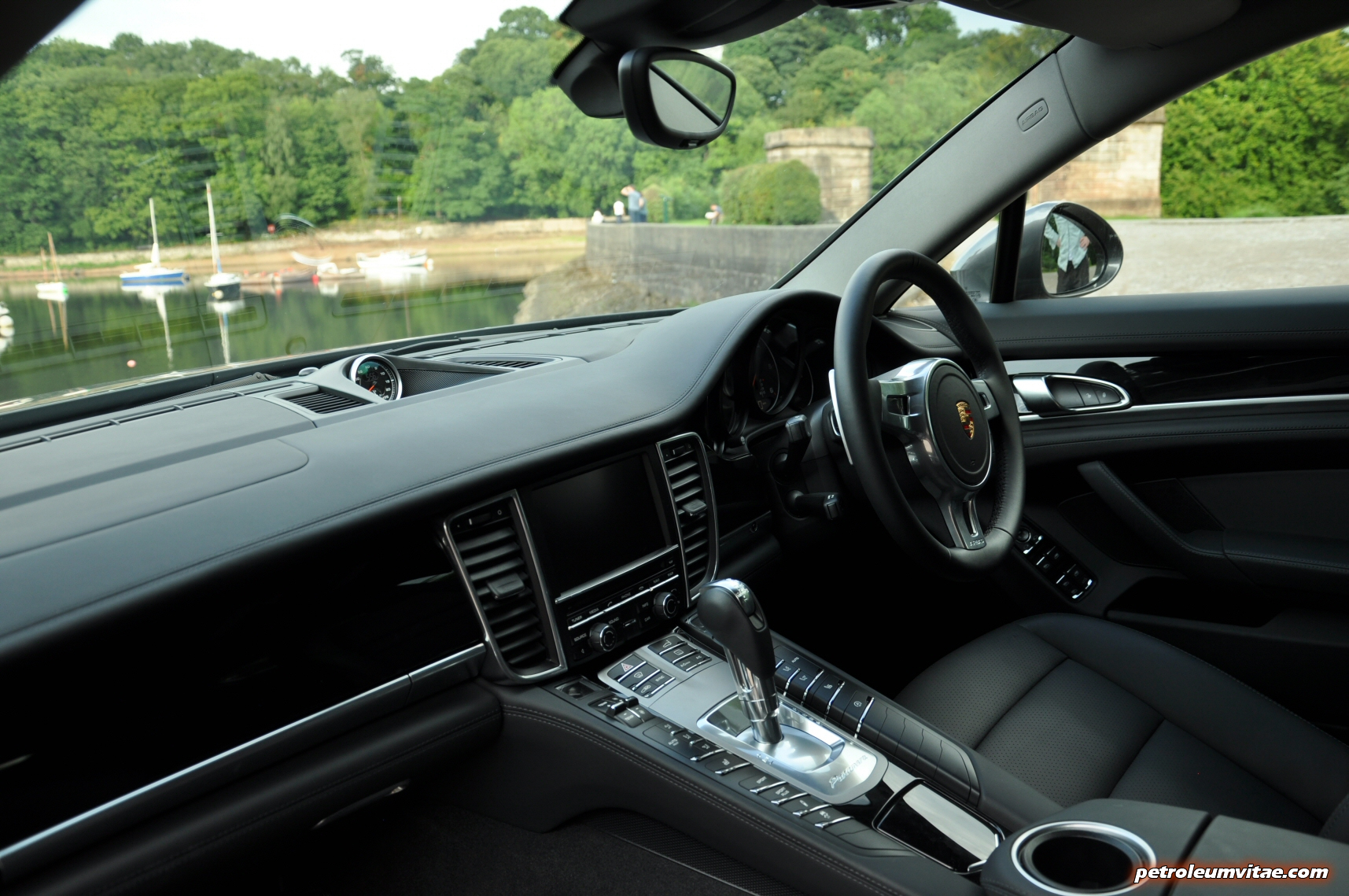 The Panamera radiates tremendous presence both on the road and on the driveway. It’s not surprising, really, being the sizeable 5m x 1.93m machine that it is. Every time I approached it, especially from the front, my heart fluttered. Agate Grey suits the Panamera very well, the black brake callipers, evocative side air vents, pop-up rear spoiler, attractive front and rear lights, a brace of sizeable exhaust surrounds and black, high-gloss 20” sport classic alloys bolstering its aesthetic allure further. I’ve typically perceived black wheels as being a tad gangster but not so in this case.